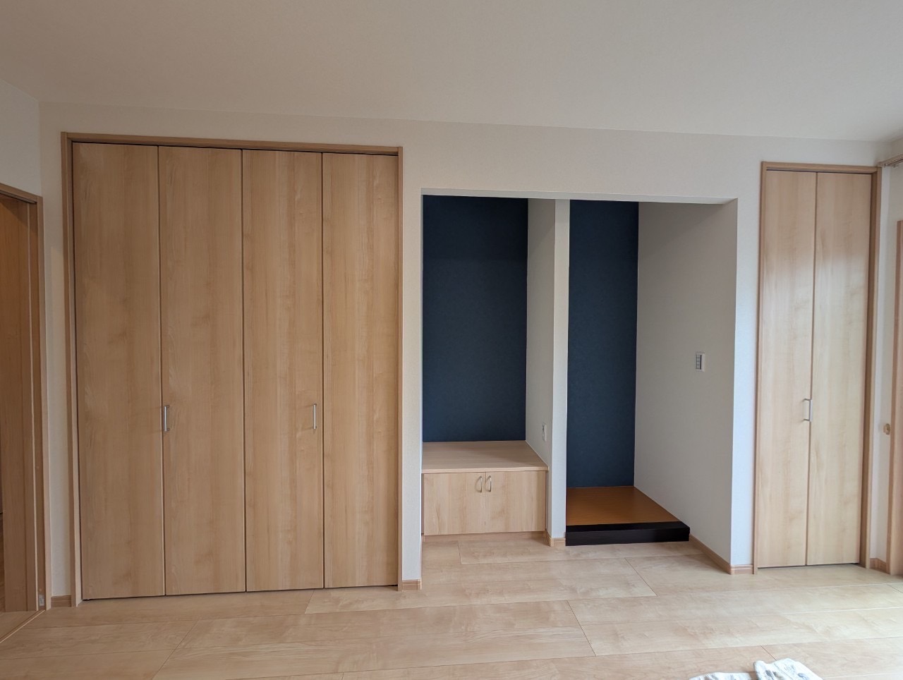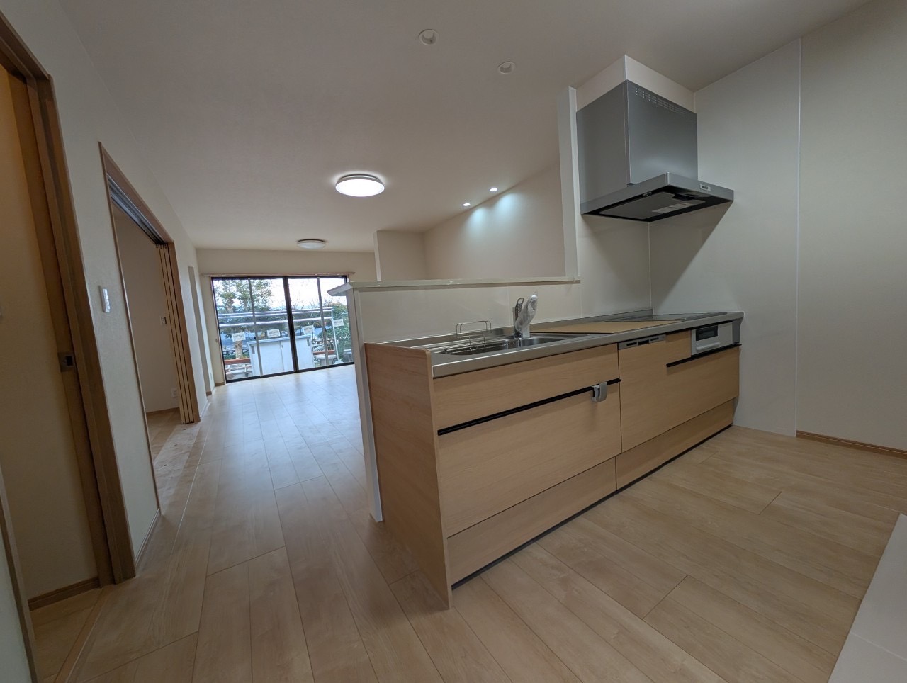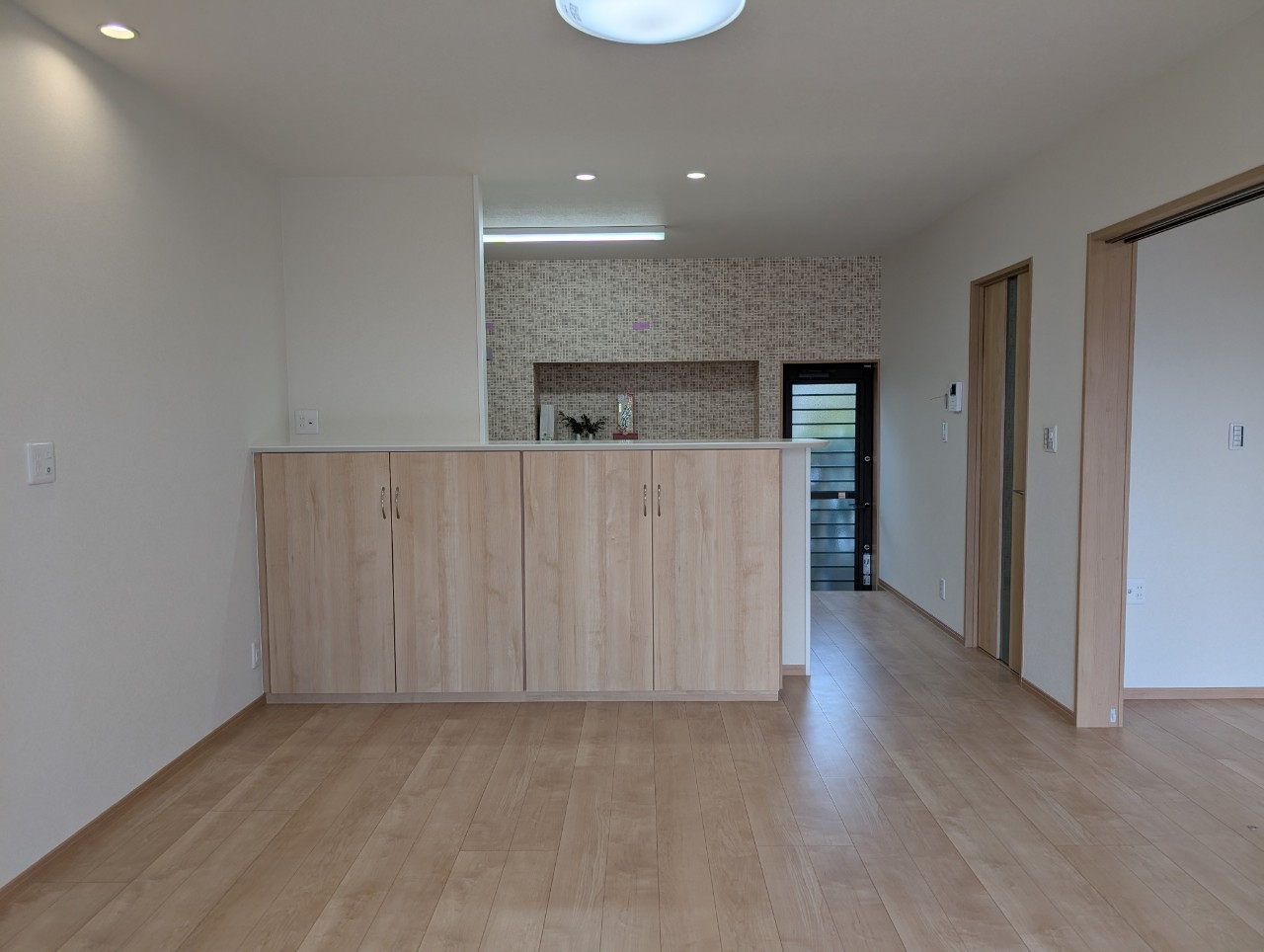 耐震化した構造、リビングが見渡せる対面キッチン、裁縫が楽しめるリビング横の造作机、キッチン前面の造作収納、台風対策の外部シャッター